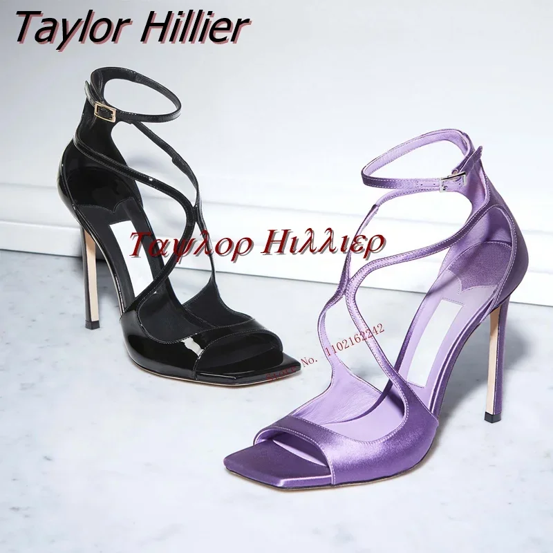 2023 Summer New Taro Purple Satin High Heels Stiletto Open Toe Sandals Square Toe Buckle Strap Sexy All-Match Women'S Shoes 45