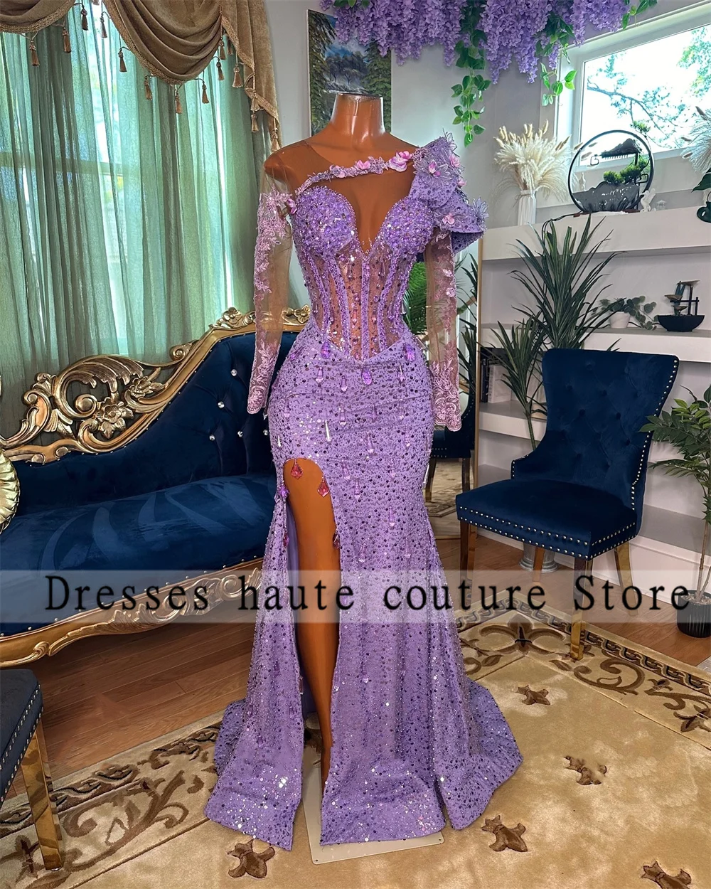 Sparkly Lavender Sequins Purple Prom Dress 2025 For Black Girl Lace Long Sleeve Rhinestones Birthday Party Gowns Customized