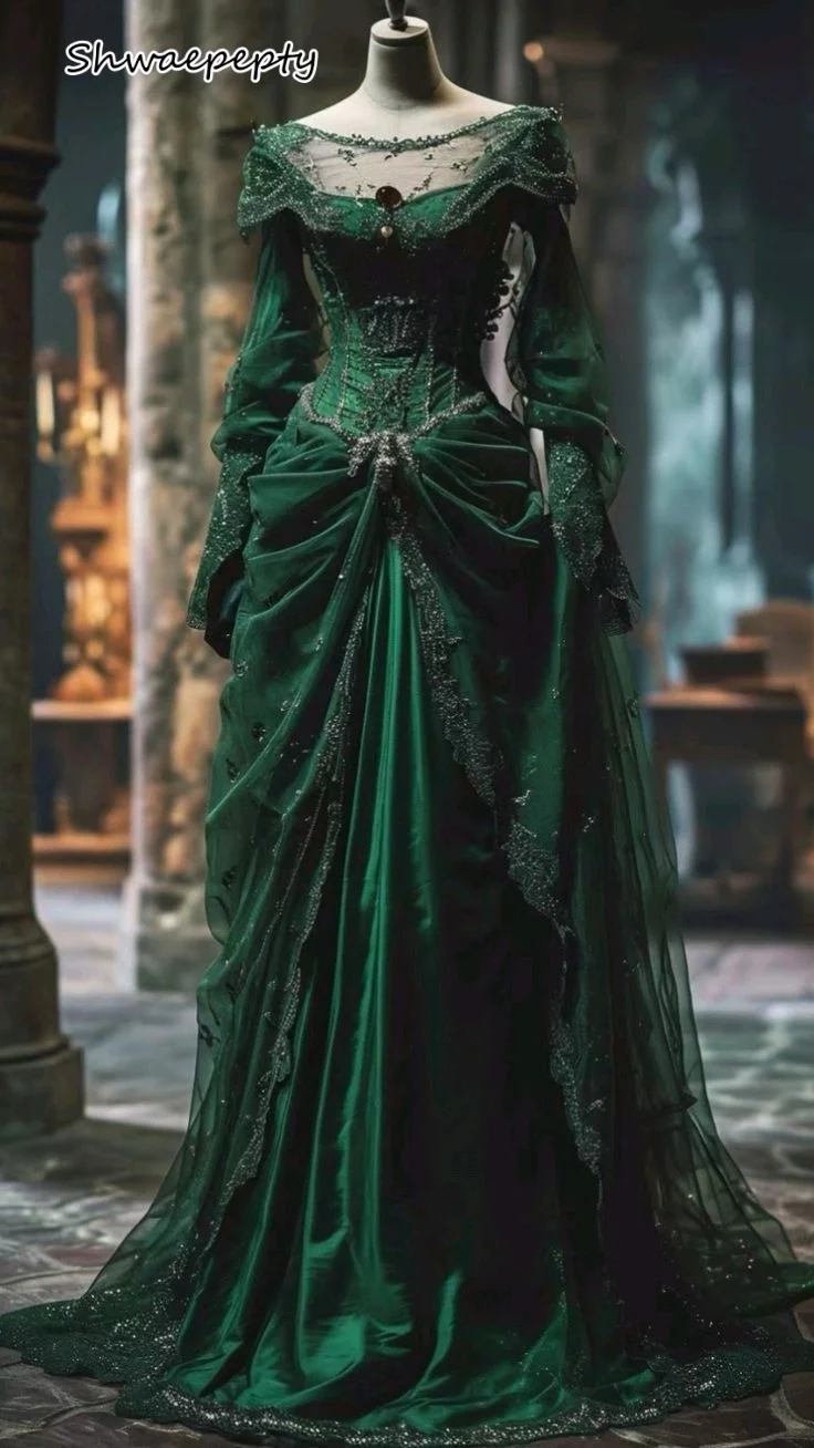 Vintage Victorian Green Prom Dress Long Sleeves Ruched A-Line Long Tulle Masquerade Dress Customized Special Occasion Wear 2025