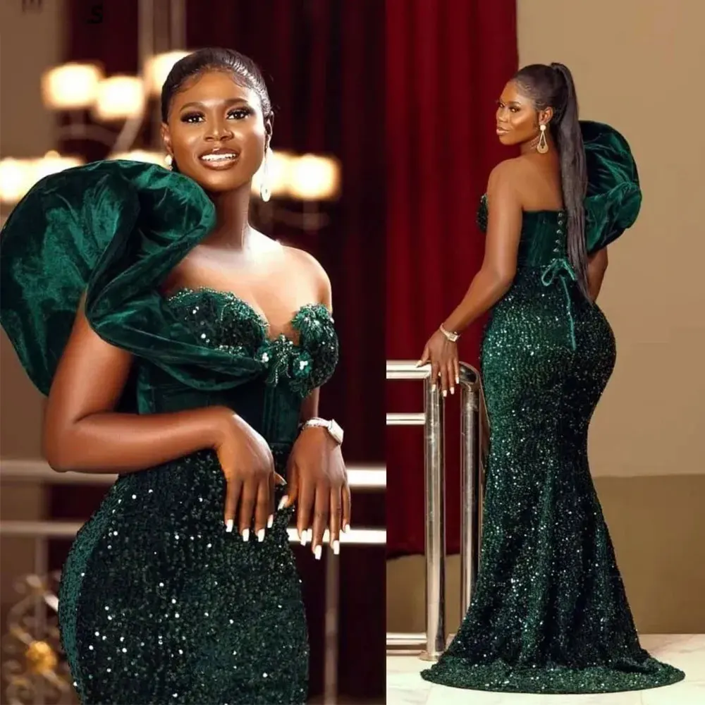 African Dark Green Sequined Prom Gowns Women Sexy One Shoulder Ruched Mermaid Evening Dresses Second Reception Robes Customized