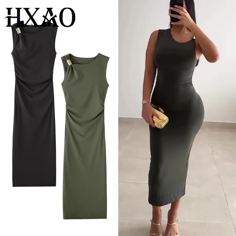 HXAO Green Women's Dress Sleeveless Black Midi Dress Ruched Party Long Dresses 2025 Woman Bodycon Summer Holiday Dresses 088