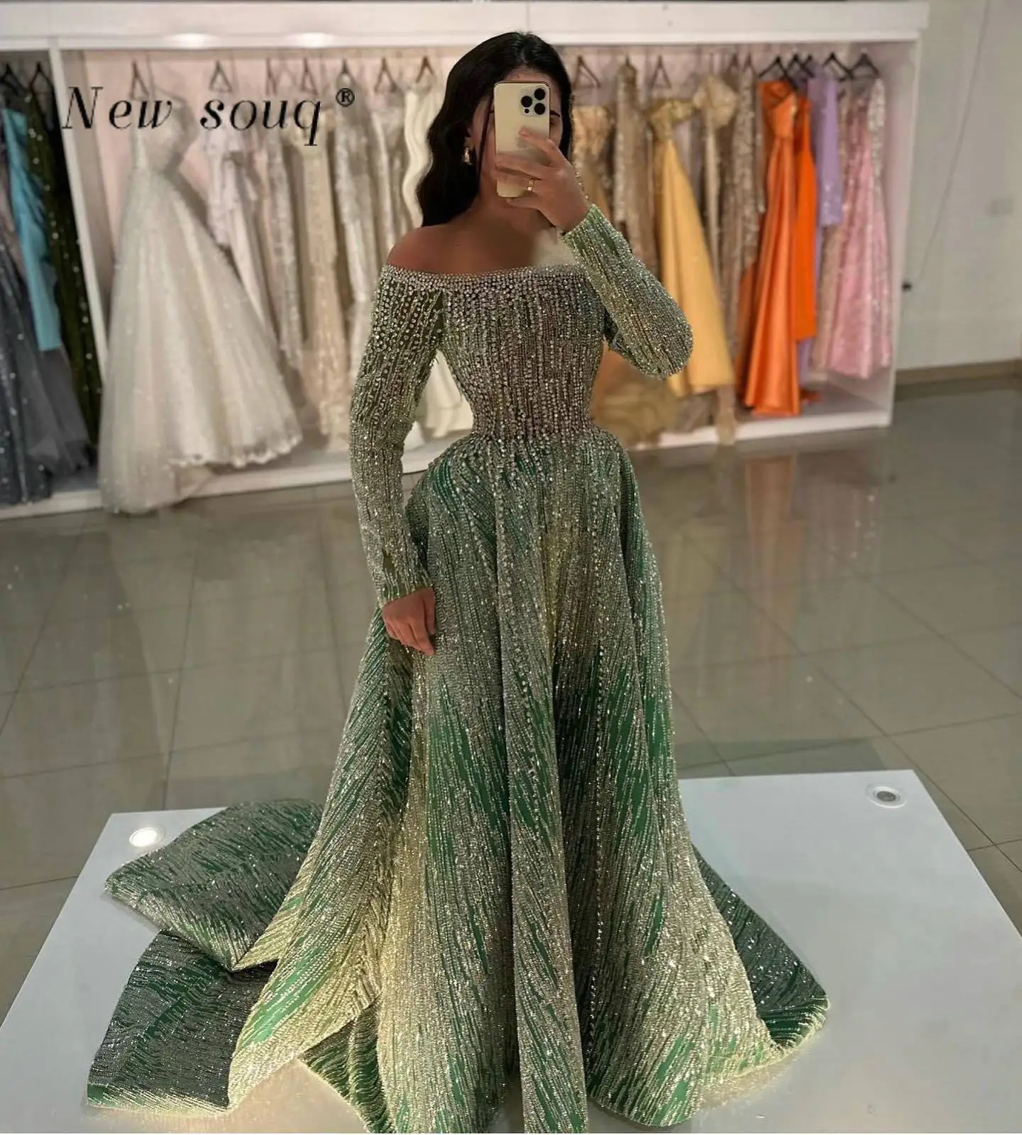 2024 Arabic Sparkling Green Boat Neck Evening Dresses Puffy A-Line Ruched Formal Gowns for Women's Wedding Party Customized