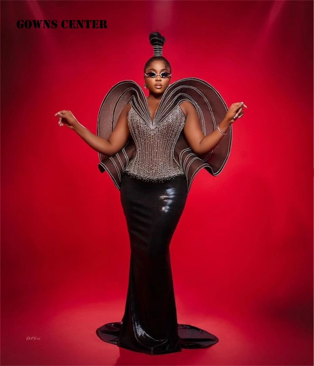 Technological Black Ruffels Shoulder Evening Gowns For Elegant Party African Crystal Beading Special Dress Black Girl Customized  Read more