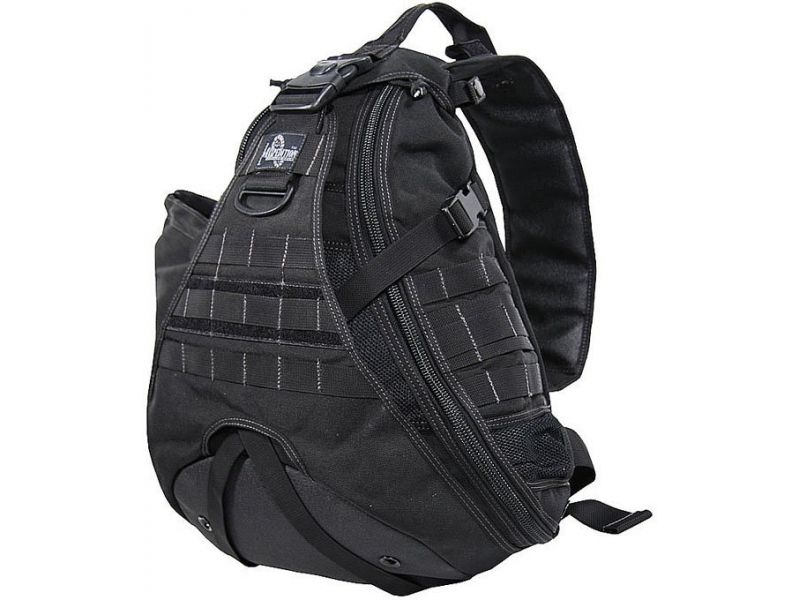 Maxpedition Monsoon Gearslinger Sling - Black - The MONSOON? GEARSLINGER? is our large size single shoulder pack with over 1600 total cu. in. of total capacity. Based on a triangular design, the main compartment contains numerous internal accessory pockets. There are drain hole grommets throughout...