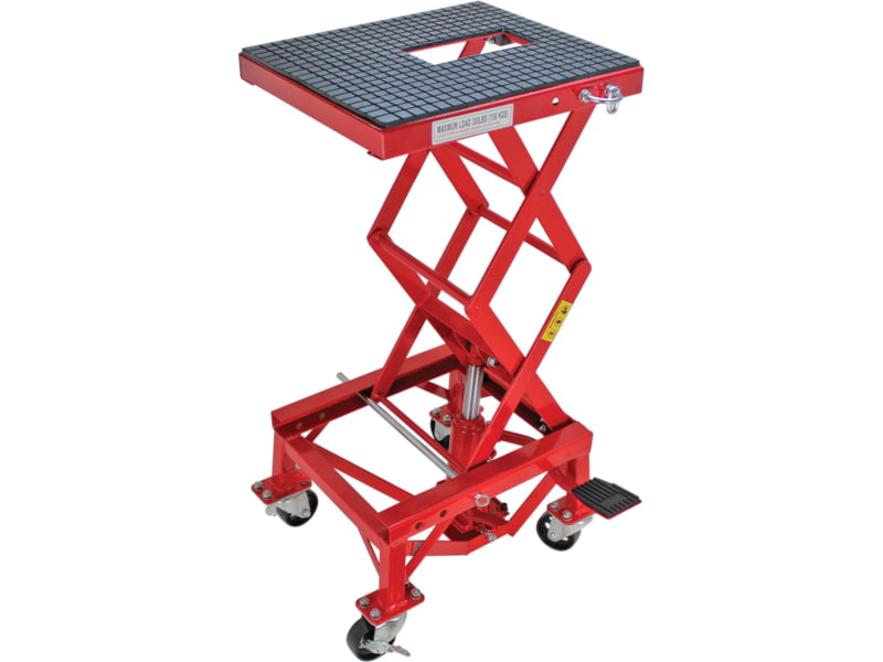 Lifting up to 300 lbs., the Hydraulic Motorcycle Lift Table is perfect for tinkering on your dirt bike or small motorcycle. Set your bike on the table, secure it through the foot pegs with the included fasteners and lift away with the easy-to-use foot...