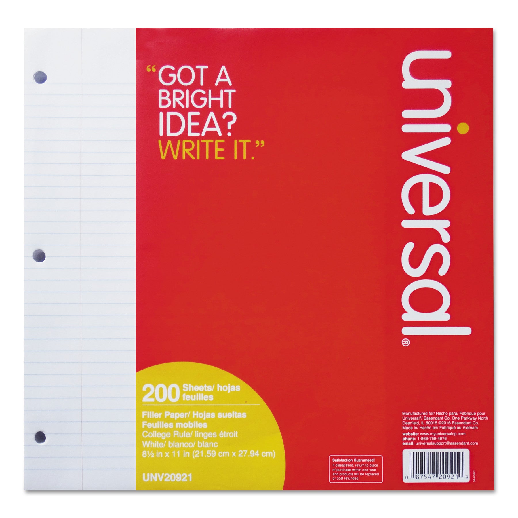 Universal 11 x 8.5 in. Mediumweight Filler Paper - 200 Sheets - DETAILS: Mediumweight Filler Paper White, 16-lb. paper, lightly ruled on both sides with red margin rule. Punched for standard three-ring binders. College Ruled 200 Sheets per Pack 11 x 8-1/2 SOLD AS: Pack STOCK NUMBER: 20921 UPC: 087547209219