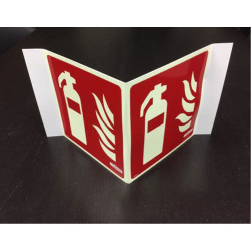 LumAware Illuminating Fire Extinguisher Panoramic Sign - Utilizes Advanced Photoluminescent Technology. Will illuminate for hours during blackout conditions. Visible from any angle and in total darkness. Sign Dimensions: 8.25 in. x 8.25 in. per side. Unlimited cycles of charge and discharge.