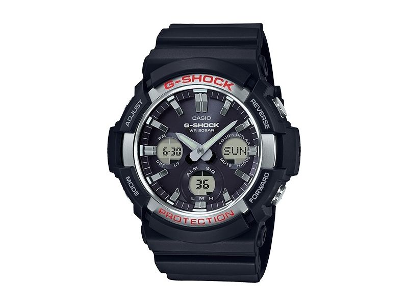 Casio Men's GAS-100-1ACR G Shock Analog-Digital Display Quartz Black Watch - Solar powered, shock resistant, mineral glass, 200-meter water resistance, double led light, world time, 1/100-second stopwatch, countdown timer, 5 daily alarms, hourly time signal, hand shift feature Battery level indicator, power saving, full...