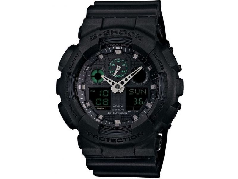 Casio G-Shock Mens LG Analog Digital Chronograph Magnetic GA100MB-1A - Going with a basic black matte finish and green accents creates a tough and cool look that is anything but basic. . . . . Shock Resistant . . Magnetic Resistant . . 200 Meter Water Resistant . . Auto LED Light with Afterglow . . World Time: 29 times...