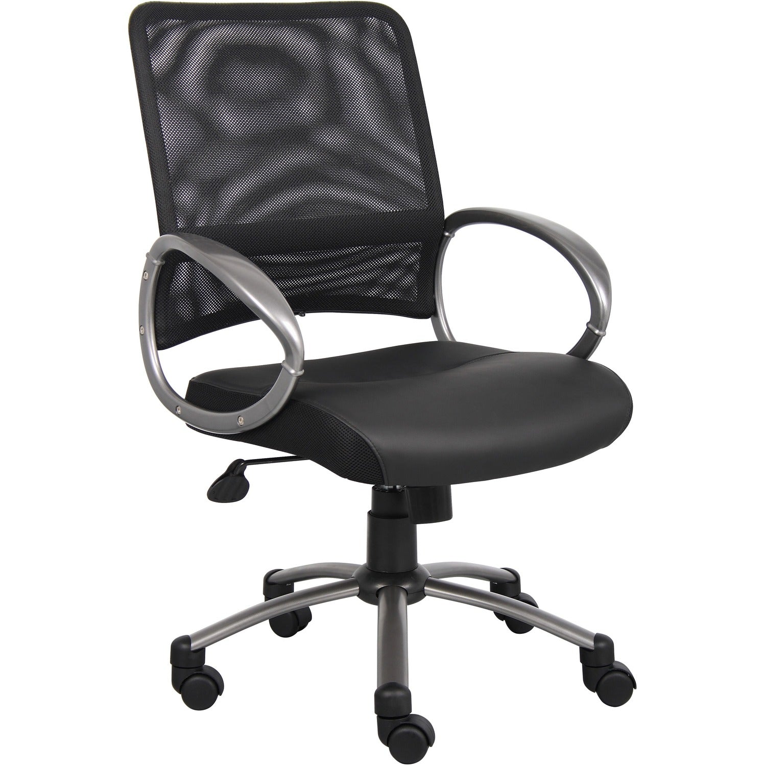 Mesh task chair offers a mesh back and bonded leather seat. Functions include pneumatic seatheight adjustment 360degree swivel tilt and tilt tension. Midback chair also features a fivestar base with hooded doublewheel casters.
