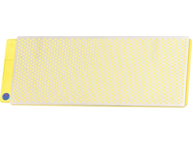 10 in. double sided, two-grit, diamond whetstone with non-skid mat. Fine and extra fine grits.