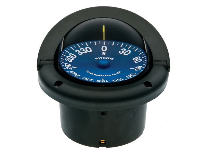 Ritchie SS1002 Hi Performance Compass - Easily installed in a 4" dia. mounting hole, this flush-mount, easy-to-read compass has a 3 3/4" PowerDamp Plus, high-visibility blue dial with extra large white numerals.