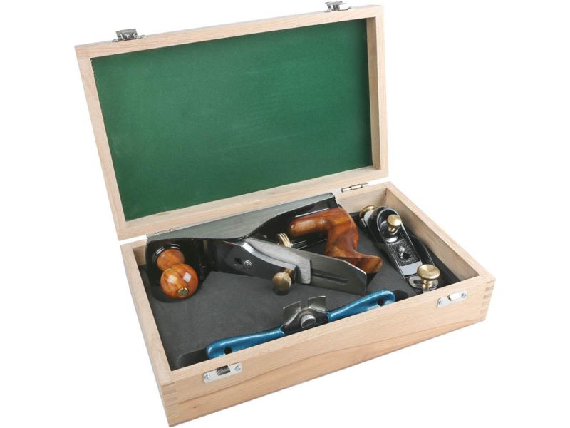 We've got all your hand planing needs covered with this set of three precision made cast iron planes in a fitted wooden box. Set includes a 6" long low angle block plane with adjustable throat, a 9-3/4" long smoothing plane with rosewood handles and a...