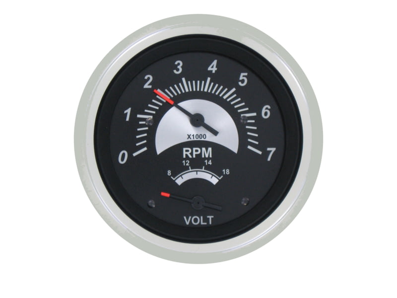 Black Sterling instruments have white graphics and black background on spun aluminum dial, scratch-resistant domed glass lens, perimeter lit dial, elite stainless steel bezel, black pointer with fire orange tip. Size: 3" Dial Range: 0-7000 RPM , 8-18...