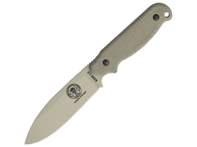 ESEE ESLSPDT-BRK Laser Strike screenshot. Hunting & Archery Equipment directory of Sports Equipment & Outdoor Gear. Click to enlarge product image  ESEE ESLSPDT-BRK Laser Strike - 10" overall. 4 7/8" textured Desert tan powder coated 1095 carbon steel blade with thumb ridge. Full tang. Desert tan canvas Micarta handles. Handle features a divot that can be used as the socket for the fire bow drill method. Stored inside handle is...