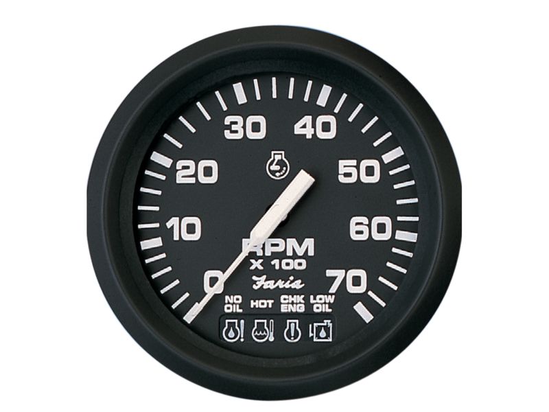 Faria Perimeter-Lighted Euro 7,000 RPM OMC System Check Tach FAR32850 screenshot. Marine Electronics directory of Electronics. Click to enlarge product image  Faria Perimeter-Lighted Euro 7,000 RPM OMC System Check Tach FAR32850 - Perimeter lighted black dial, black alum bezel, flat glass lens.