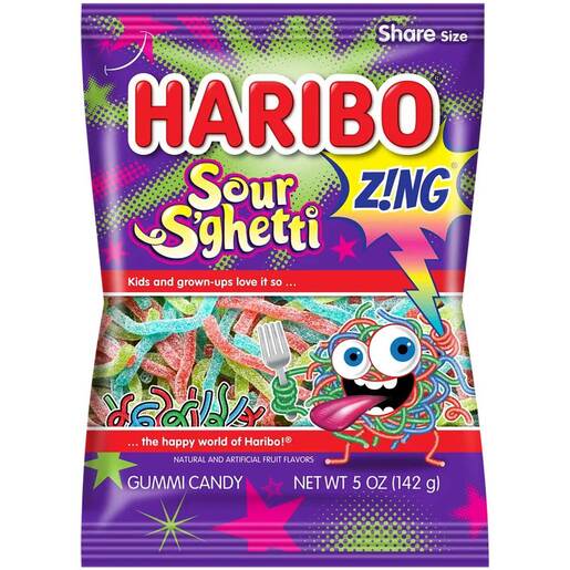 Haribo S'ghetti - Are you ready for the crazy sour flavors of HARIBO Sour S’ghetti? Extra-sour strands of sugar-coated Strawberry, Blueberry, Green Apple, and Watermelon tangle and tango together in every bag.  Read more