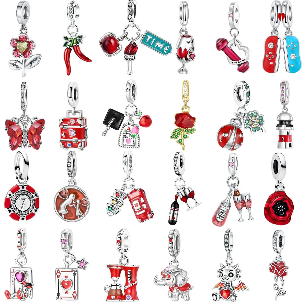 Original 925 Sterling Silver Red Series Charms Heart Butterfly Flowers Apple Beads Pendants Fit Bracelets DIY Fine Jewelry Gifts