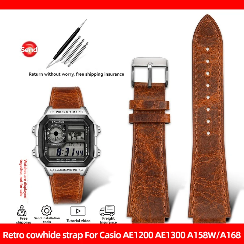 Retro cowhide Watchband For Casio AE1200 AE1300 A158W/A168 W-216H AQ-150W Vintage Watch Strap 18MM Convex mouth Men's Bracelet
