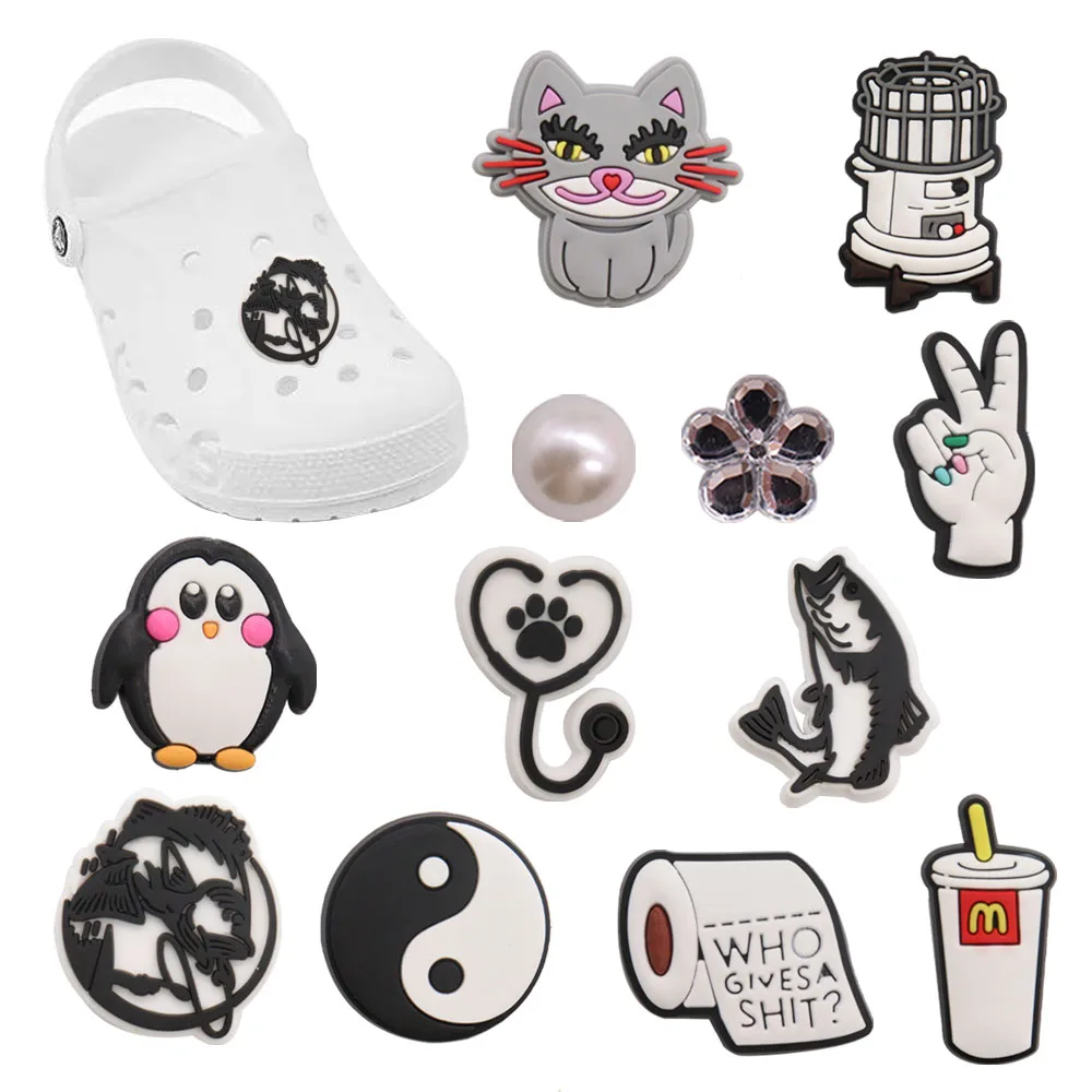 1-12Pcs PVC Lovely Penguin Fish Cat Kids Shoe Charms Buckle Clog Yin And Yang Shoe Decoration Fit DIYcuteParty Gift