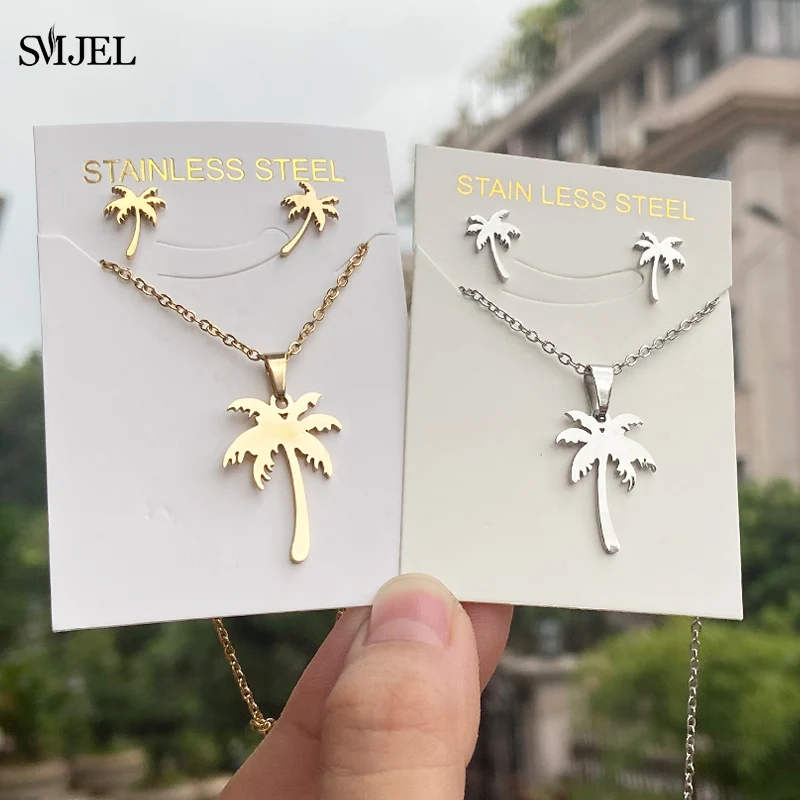 New Stainless Steel Coconut Tree Necklace For Women Lover's Hawaii Beach Palm Tree Earrings Necklaces Engagement Jewelry Gifts