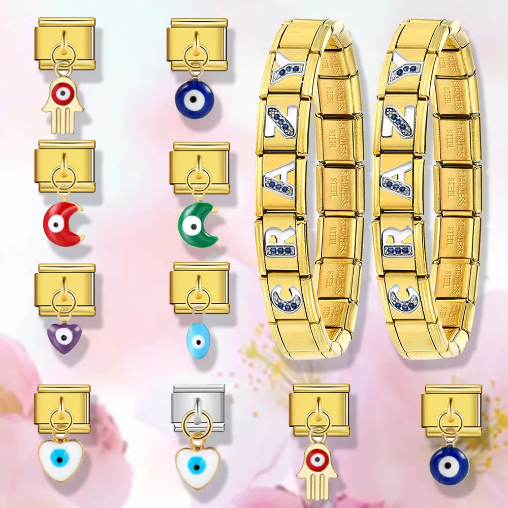 URING Gold Color Pendant Charms Bracelets Palm Hearts Moon Devil's Eye Stainless Steel Link Fit 9mm Making DIY Italian Jewelry