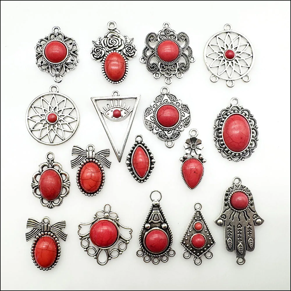 Flower Teardrop Palm Pendants Antique Silver Color Red Turquoise Charms For Bracelets Charms Making Jewelry