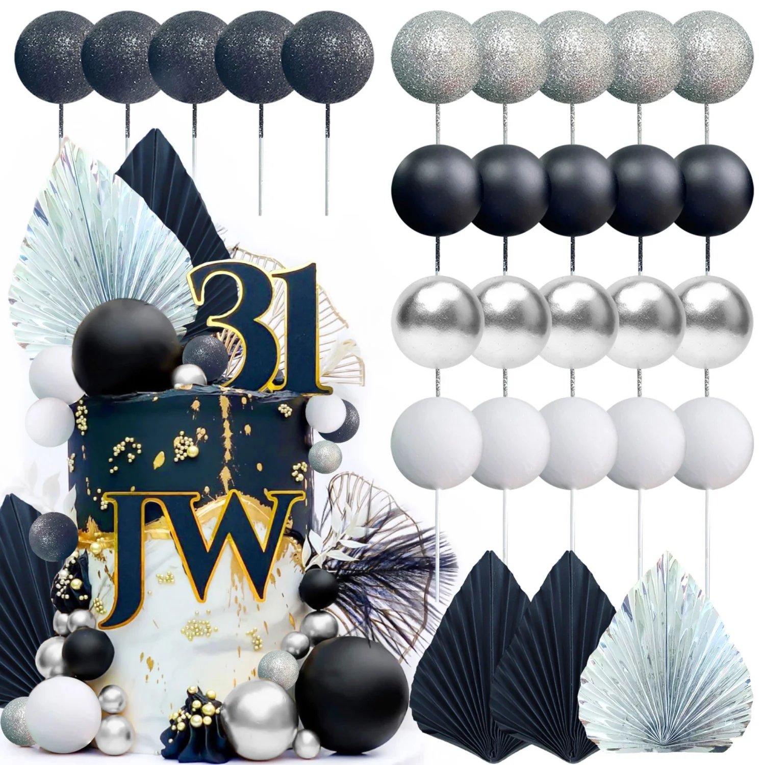 LaVenty Black Sliver Balls Cake Decoration Silver Palm Leaves Cake Decoration Goth Black Cake Topper for Birthday Wedding