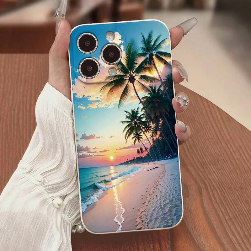Phone Case For iPhone 16 15 14 13 12 11 Pro Max XS X XR 7 8 Plus soft Clear Cover Summer Beach Scene at Sunset on sea Palm Tree