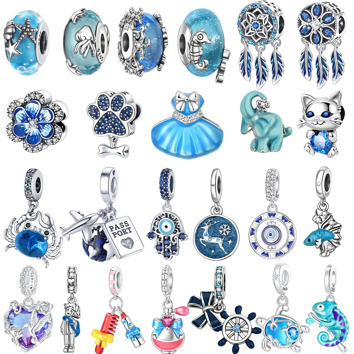 New Original 925 Sterling Silver Blue Charms Holy Mother Palm Heart Cat Beads Pendants Fit Bracelet Necklace DIY Jewelry Gift