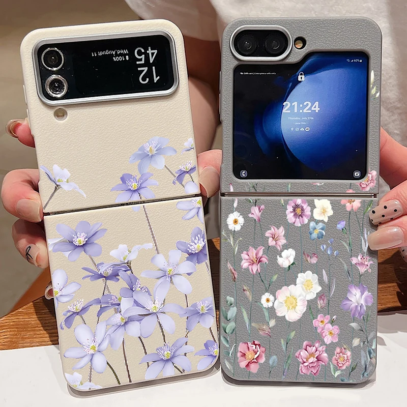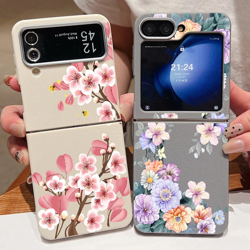 For Samsung Galaxy Z Flip 3 5 4 6 5G Floral Flowers Phone Case Leather Texture Soft TPU Folding Cover For Samsung Z Flip4 Flip5