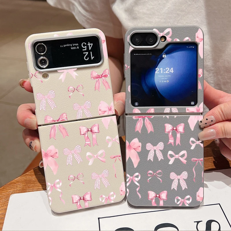 Pink Bowknot Phone Case For Samsung Galaxy Z Flip 7 6 5 4 3 Leather Texture TPU Folding Cover For Samsung Z Flip7 FE Flip5 Flip6