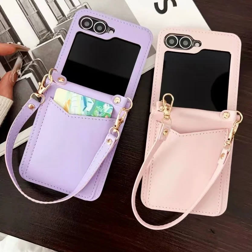 Card Slot Wallet Cover Funda For Samsung Galaxy Z Flip 6 Wrist Strap Leather Phone Case For Samsung Galaxy Z Flip 7 5 4 3 Case