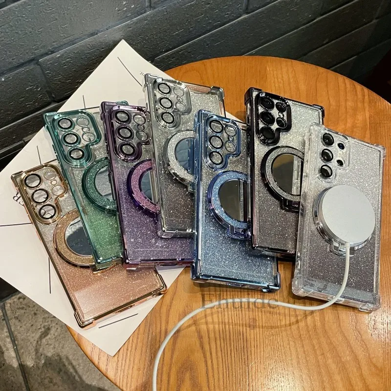 Four Corner Shockproof Acrylic Case For Samsung Galaxy S24 Ultra S23 S22 S21 Plus FE Clear Glitter Mirror Magnetic Stand Cover