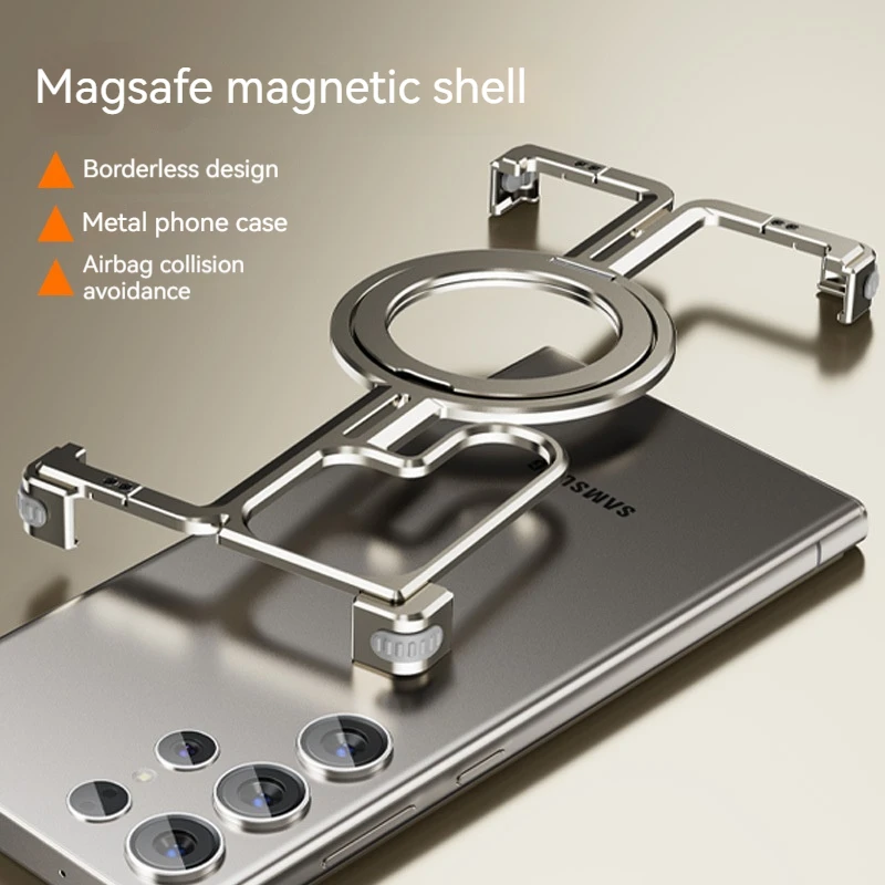 Magnetic Metal Bracket Phone Case For Samsung Galaxy S24 S23 Ultra Aluminum Alloy Frameless Bumper With Finger Ring Phone Cover