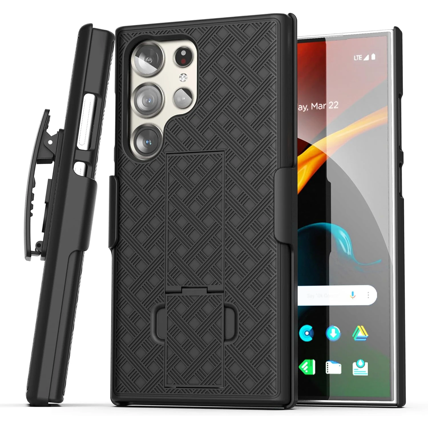 Woven 2 in 1 Hybrid Hard Shell Holster Combo Case With Kickstand & Belt Clip For Samsung Galaxy S24 Ultra 5G 6.8 Inch 2024
