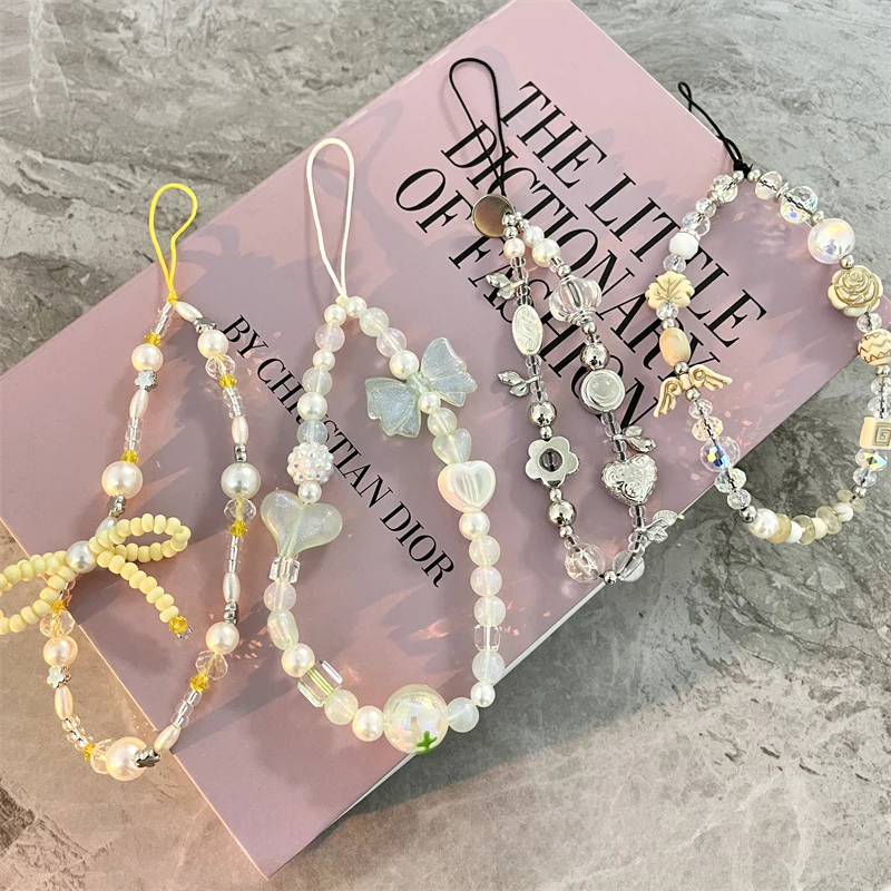 Korea Y2K Cute Bow Flower Heart Beaded Phone Chain Charm Lanyard For iPhone Huawei Samsung Universal Accessories Jewelry Pendant