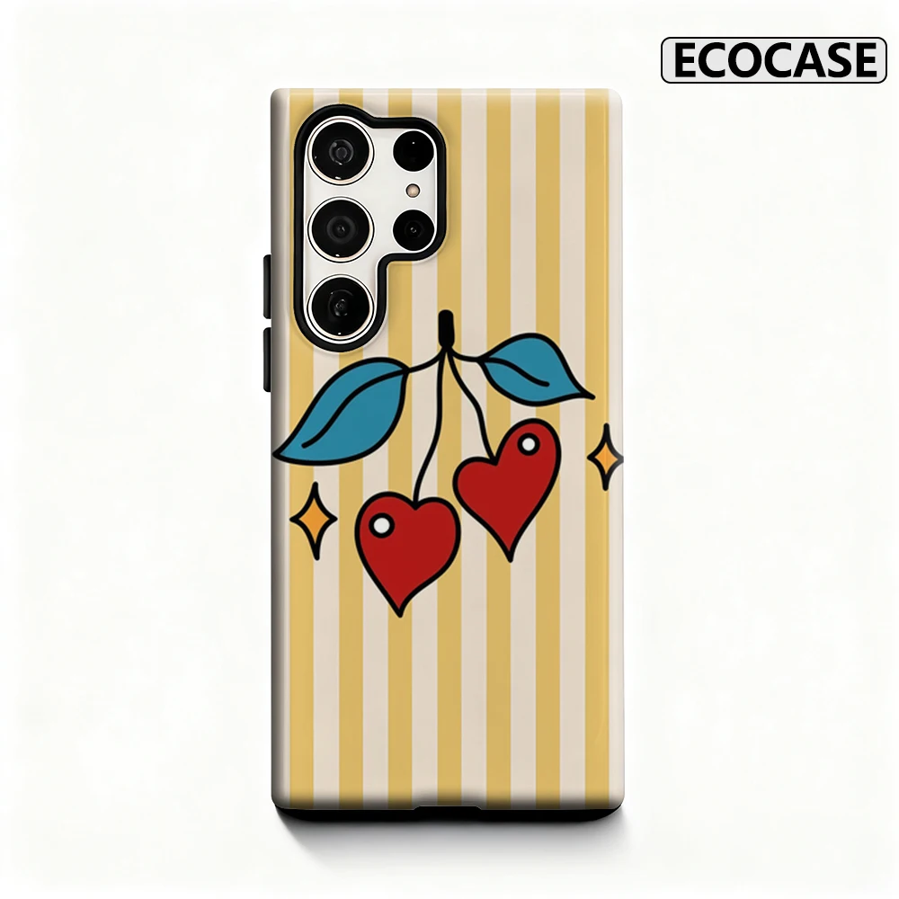 Yellow Striped Cherry Heart Phone Case for Samsung Galaxy S25 Ultra S24 S23 Ultra Plus Glossy Double-layer Back Cover