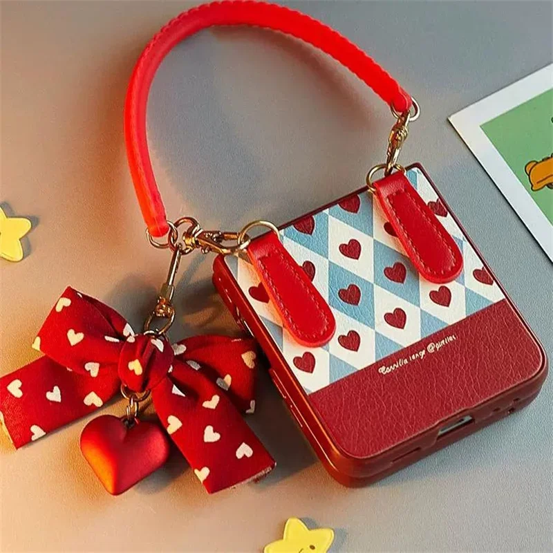 INS Retro Heart Case For Samsung Z Flip 6 flip5 Lovely Bow Wrist Strap Cover For Samsung Galaxy Z Flip 7 3 Luxury Leather Cases