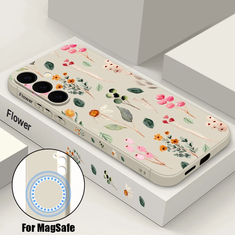 Flower Magnetic Soft Phone Case For Samsung Galaxy S25 S24 S23 S22 Ultra Plus S24 FE For Magsafe Wireless Charge Lanyard Cover