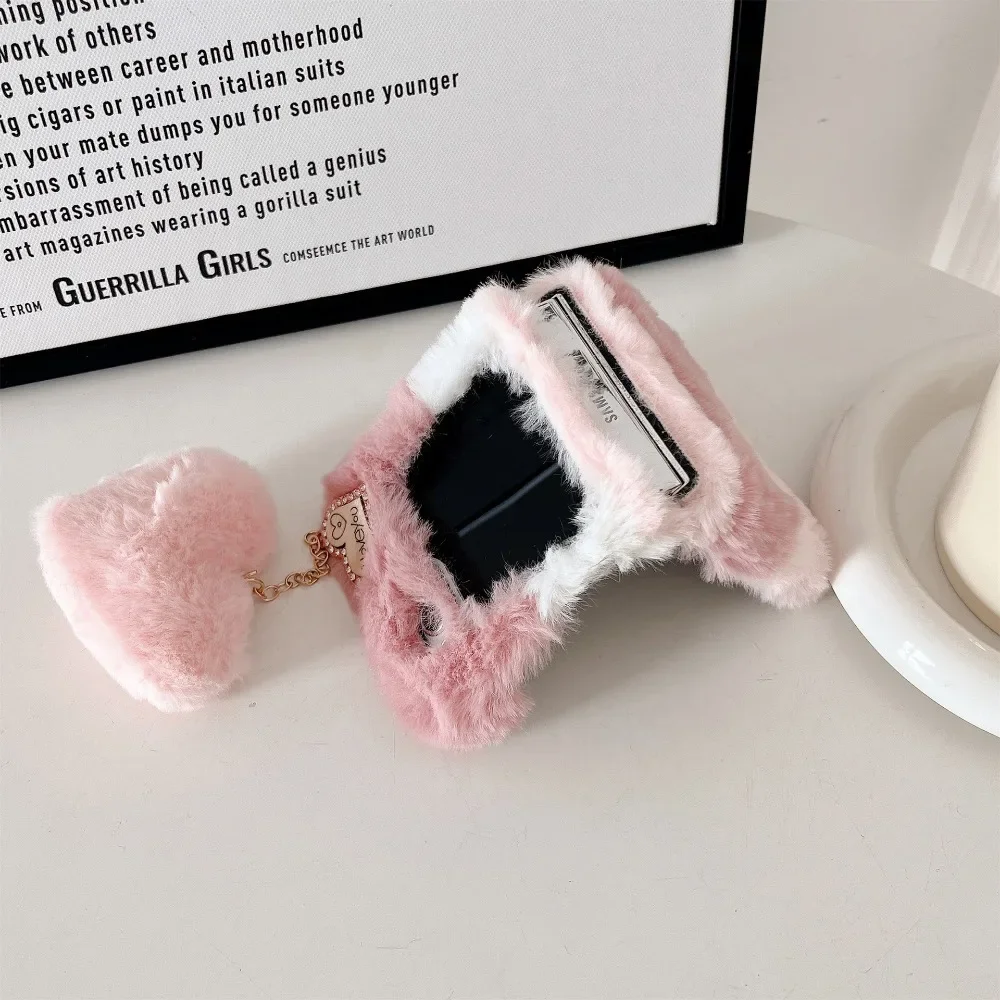 Cartoon Hairy Cute Soft Funny Fluffy Phone case with Love Heart Chain For Samsung Galaxy Z Flip 5 4 3 Flip5 Flip4 Flip3 5G Cover
