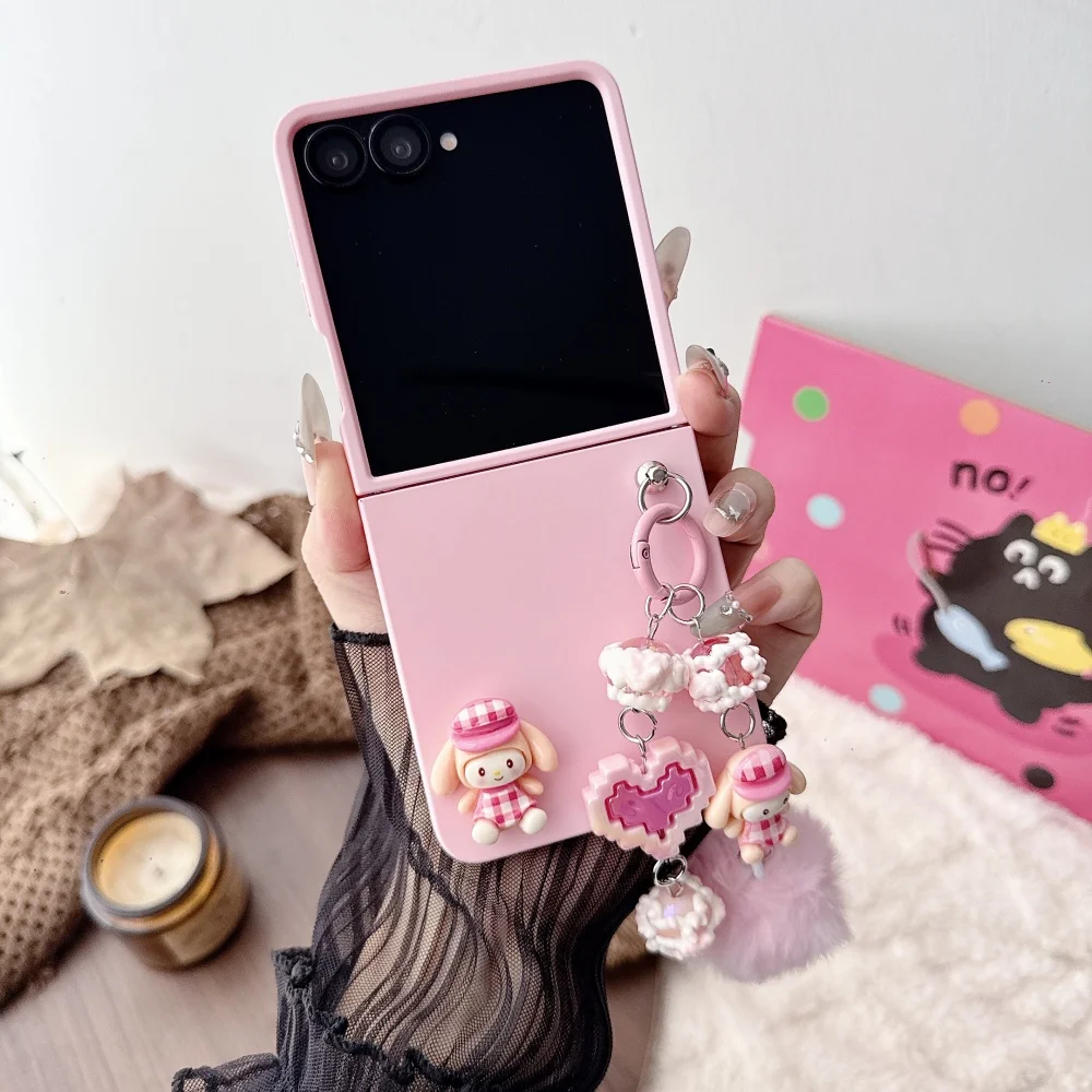 INS Korean Sanrio Cute Solid Color with 3D Heart Pendant Case for Samsung Galaxy Z Flip7 6 5 4 3 Flip 7 Shockproof Back Cover