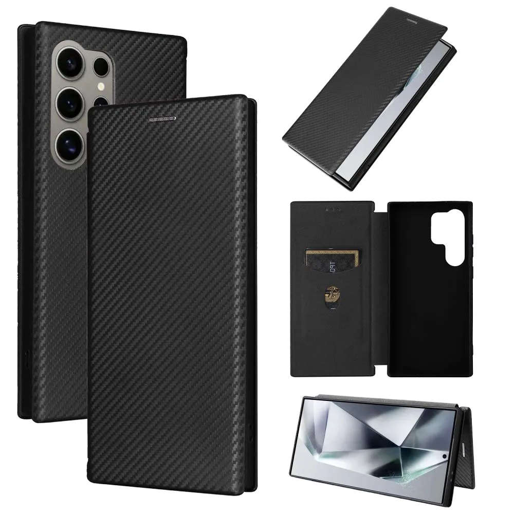 Magnetic Close Carbon Fibre Flip Cover Leather Wallet Case For Samsung Galaxy S25 Ultra S24 S23 S22 S21 S20FE S24FE S23FE S21FE