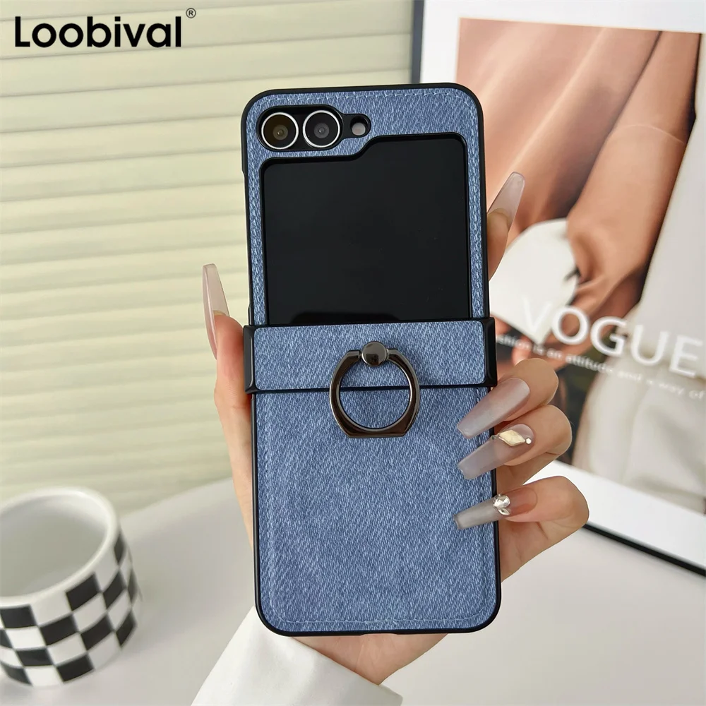Zflip7 Y2K Washed Color Denim Jeans Magnetic Case For Samsung Galaxy Z Flip 7 6 5 4 3 Flip6 Hinge 2in1 Ring Holder Bracket Cover