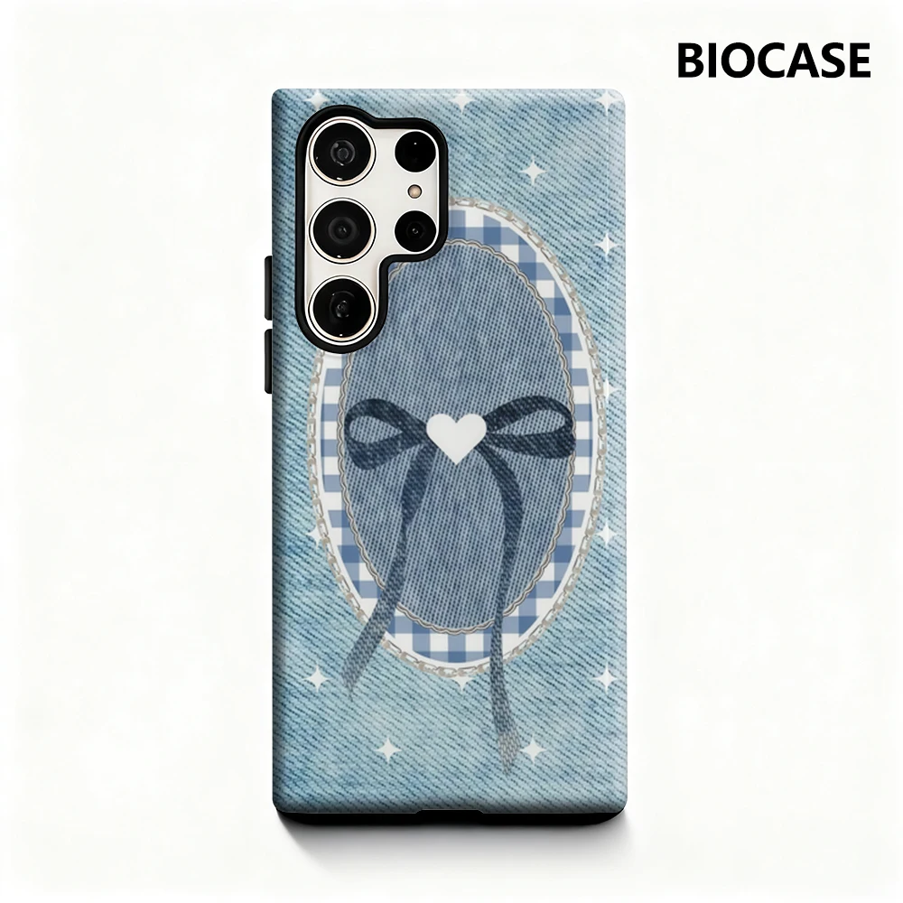 Denim Gingham Bow Heart Phone Case for Samsung Galaxy S25 Ultra S24 S23 Ultra Plus Glossy Double-layer Back Cover