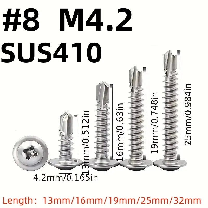 50PCS #8 M4.2 410 Self Tapping Screws Stainless Steel Sheet Metal Flat Head High Strength Quick Drilling Fasteners