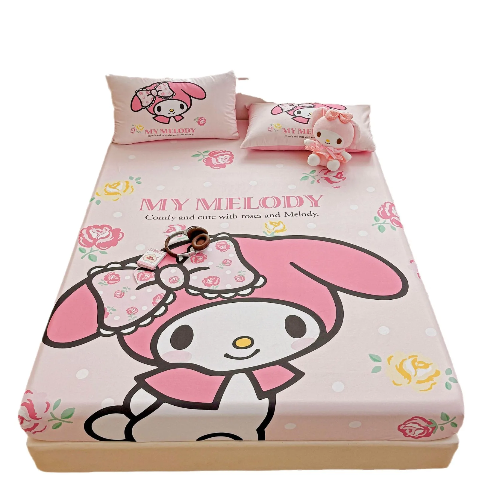 New Printed SanrioS Fitted Sheet Melody Hello-Kitty Fitted Bed Sheet Stretch bed sheet with pillowcase Fade-resistant For Childr