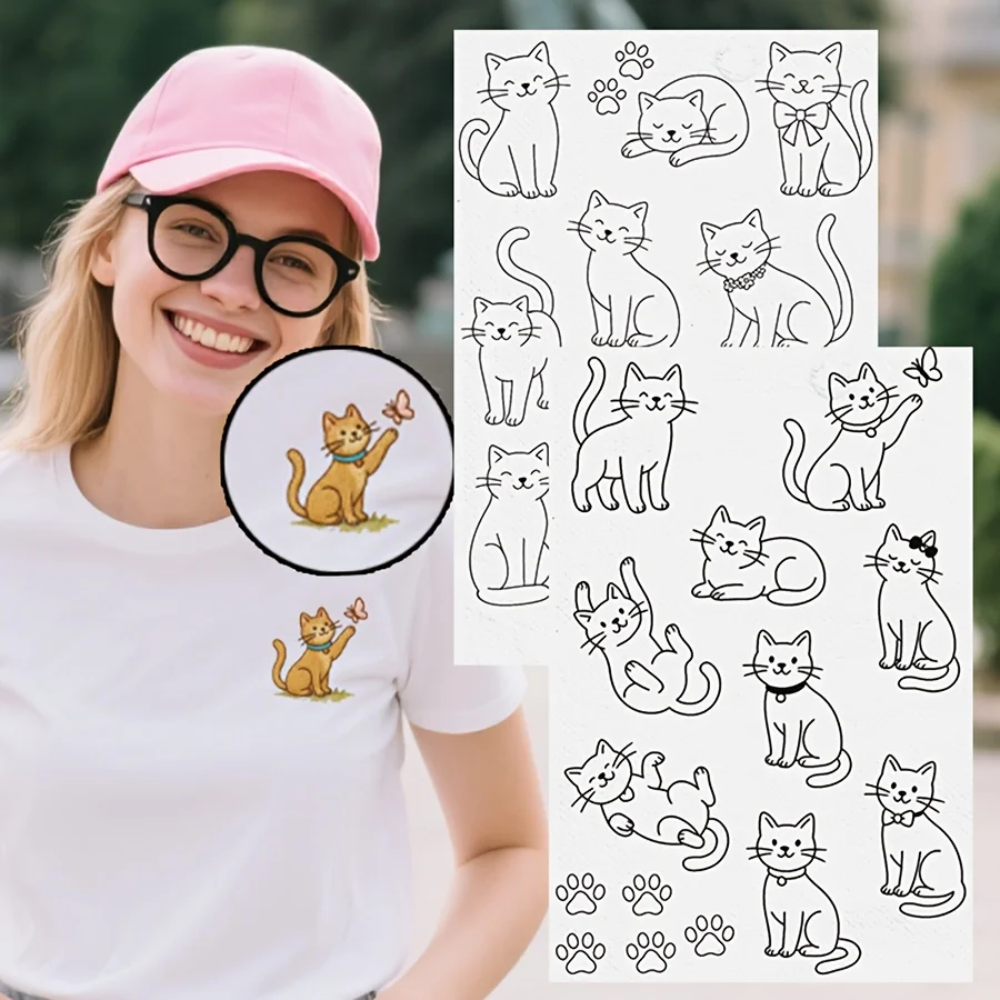 2 Sheets A4 Embroidery Transfer Paper - Pre-Printed Cat Designs with Cute Kittens, Self-Adhesive Water-Soluble Fabric for Sewing