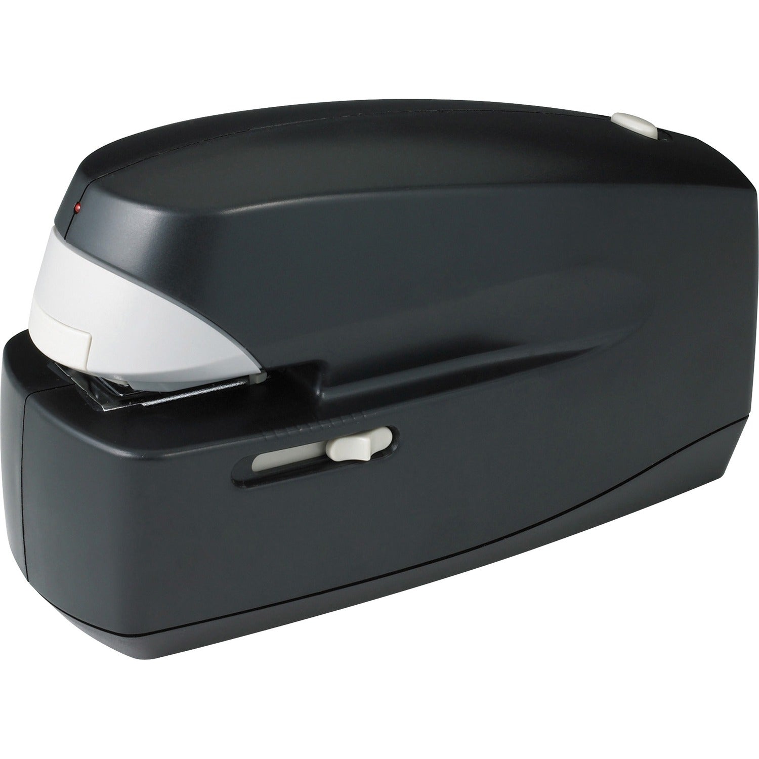Electric stapler fastens 25 sheets at a time. Features simple push button operation for front staple loading and stapling depth adjustment. Low staple light shows when stapling supply needs to be replenished. Stapler has a 35mm throat. Uses a full...  Read more
