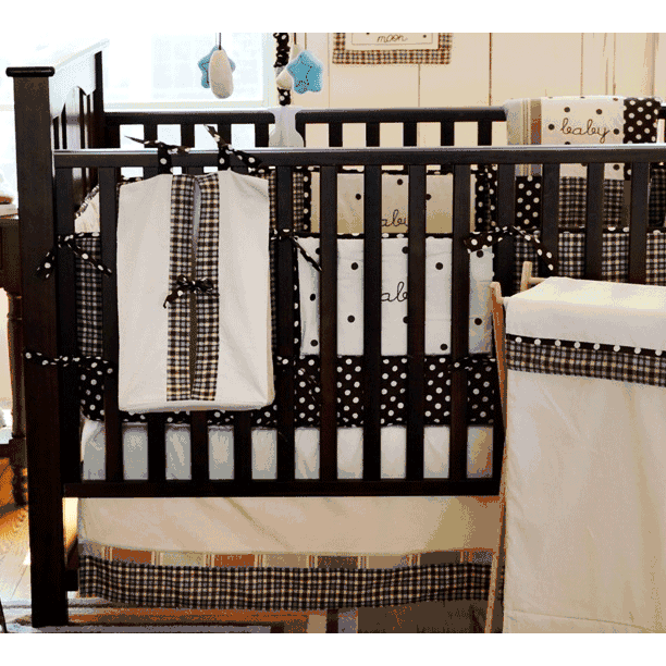 Chocolate & teal colors in gingham, stripe and polka dot patterns make this set is our #1 selling boy crib ensemble! Teal and chocolate are modern yet sweet. 3 Piece Collection includes; sheet, skirt, quilt. Chocolate Polka dot sheet is 100% cotton....